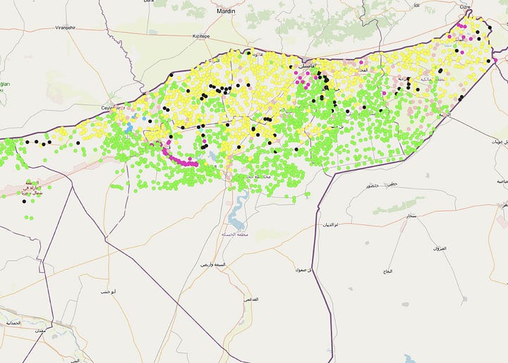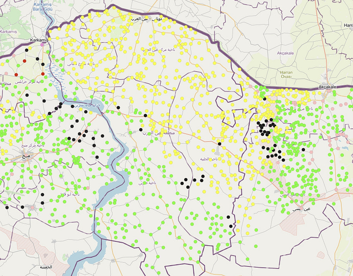 With the failure and reported end of talks between the government and SDF things are currently heading in a very dangerous direction. The SDF and much of the Kurdish population residing in the Kobani and Hasakah areas have increasingly come to see the conflict as existential, with arms being passed out to thousands of mobilized civilians, with rhetoric highlighting the upcoming battles as a fight to the death. Meanwhile abuses committed by pro-government forces appear to be increasing as fighting goes on, which is a very worrying sign given the previous massacres committed by government military and security forces and civilian supporters against minority communities on the coast in March and in al-Suwayda’ in July. So far the fighting in the northeast has not yet directly reached the Kurdish populated regions of Kobani and northern al-Hasakah (see map below with Kurdish towns and villages marked in yellow), but all previous efforts at deconfliction have proven futile.