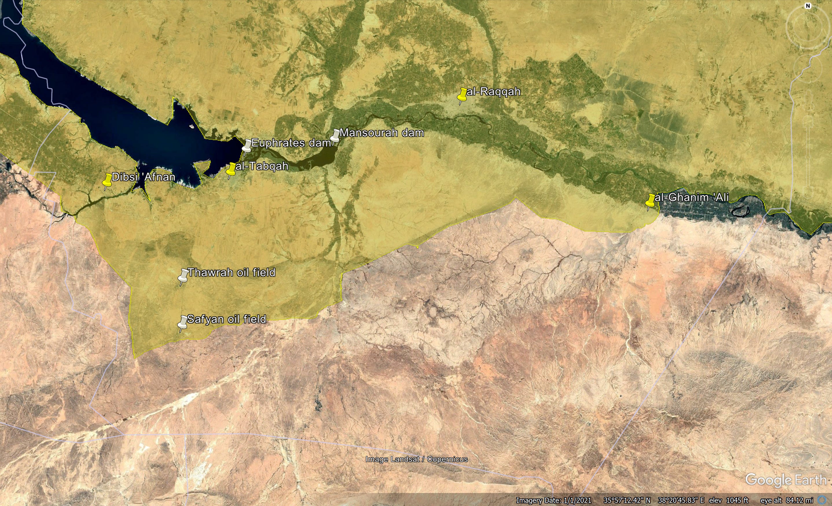 With the breakdown in any sort of negotiated handover of territory, the government initiated an offensive targeting all SDF-controlled territory on the west bank of the Euphrates. This strip of territory stretch from the aforementioned western border of al-Raqqah province 115km downriver to the town of Ghanim ‘Ali near the Deir ez-Zour border, encompassing the town of al-Tabqah, the al-Tabqah military air base, at least two oil fields, and two dams along the Euphrates.