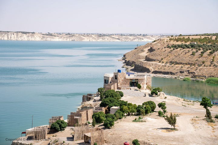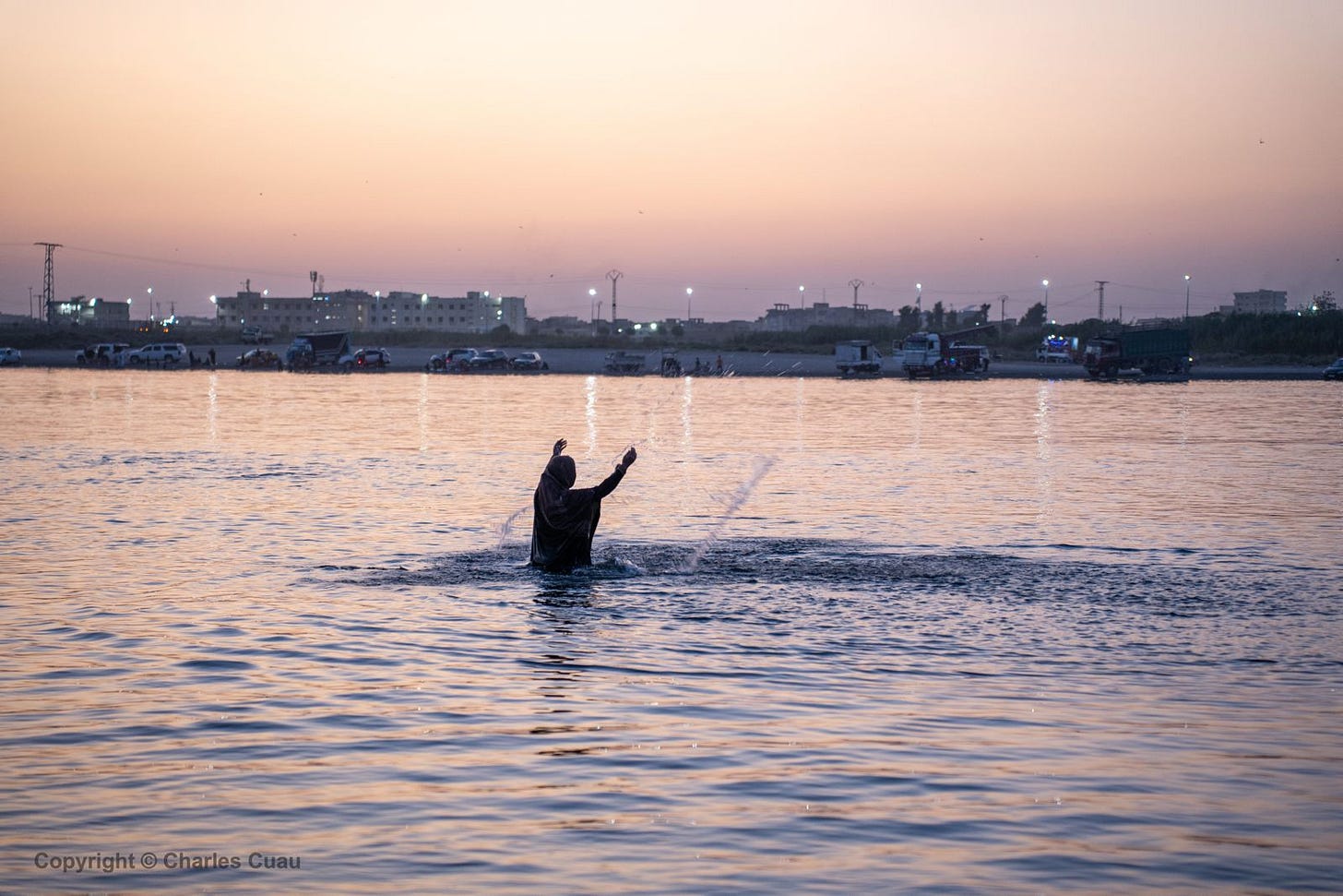 Fishing at dusk with a view of al-Raqqah and the DAANES Executive Council buildings