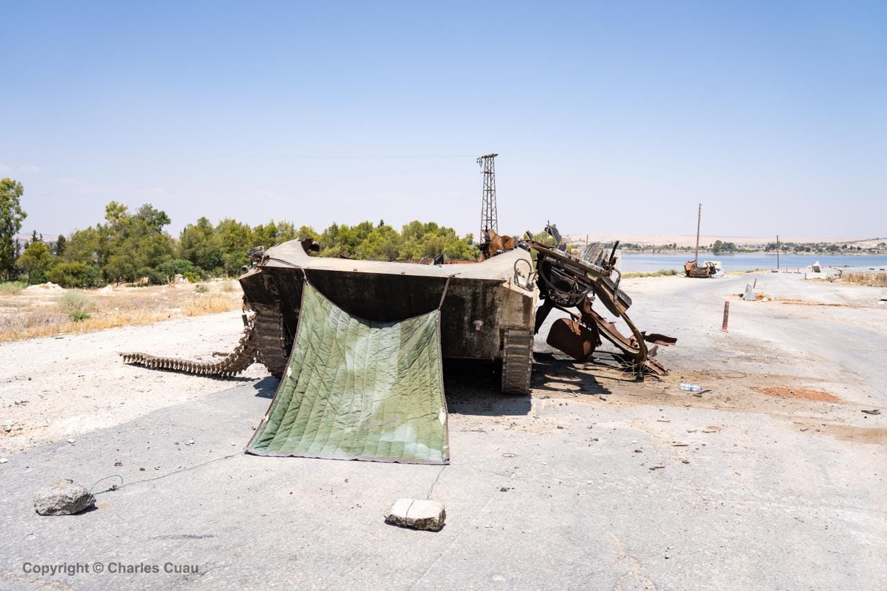 A tank destroyed in December 2024 during the SNA’s Manbij offensive, on the M4 highway just west of the Qaraqozak bridge
